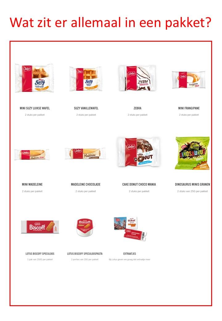 Elk zakje bevat 19 lekkernijen, waaronder de meest bekende klassiekers, zoals de 'madeleintjes' en de 'frangipannekes', de biscoff-speculoosjes, en nog veel meer!